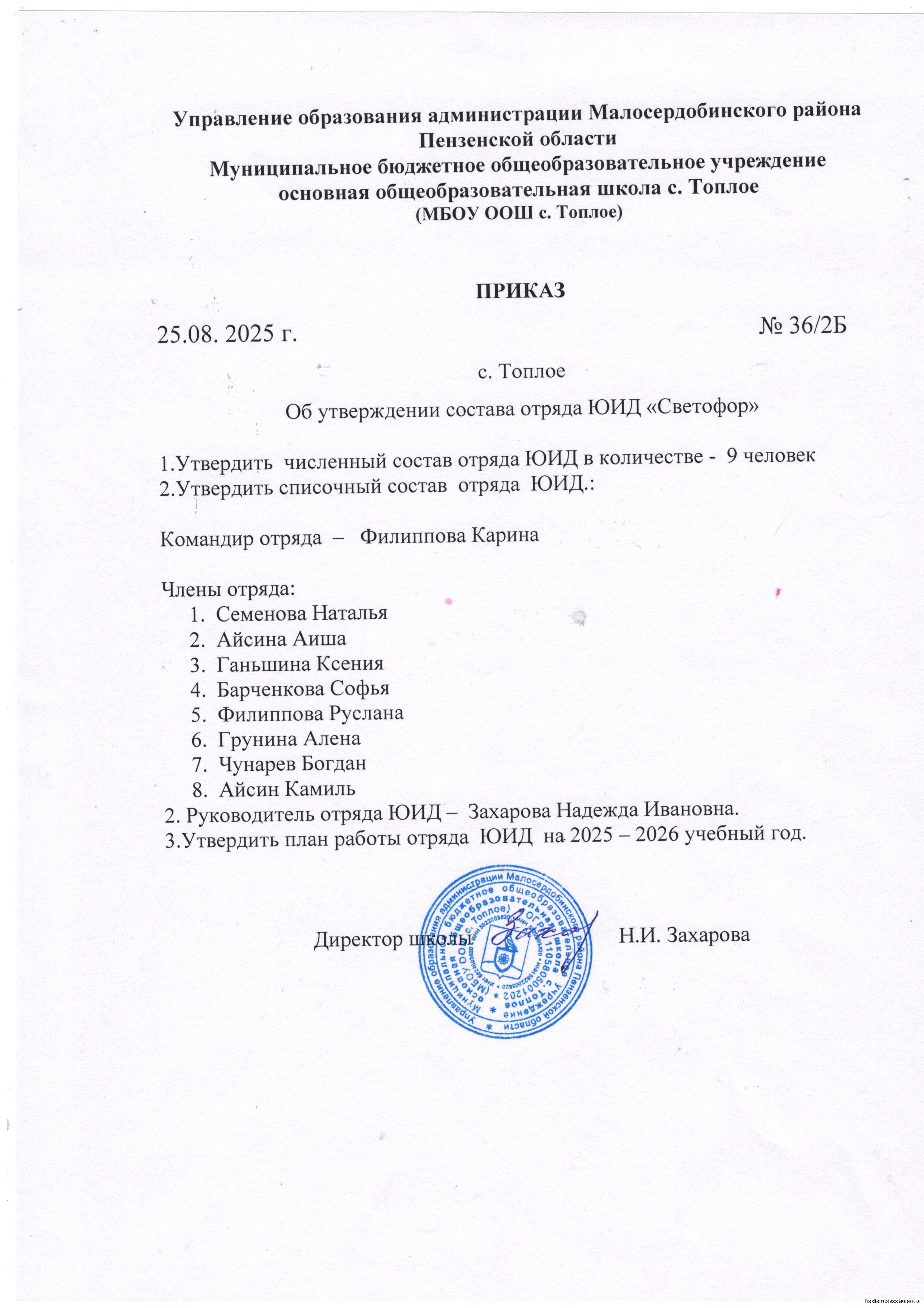 Приказ от 25.08.2025 г. №36/2Б "Об утверждении состава отряда ЮИД "Светофор""