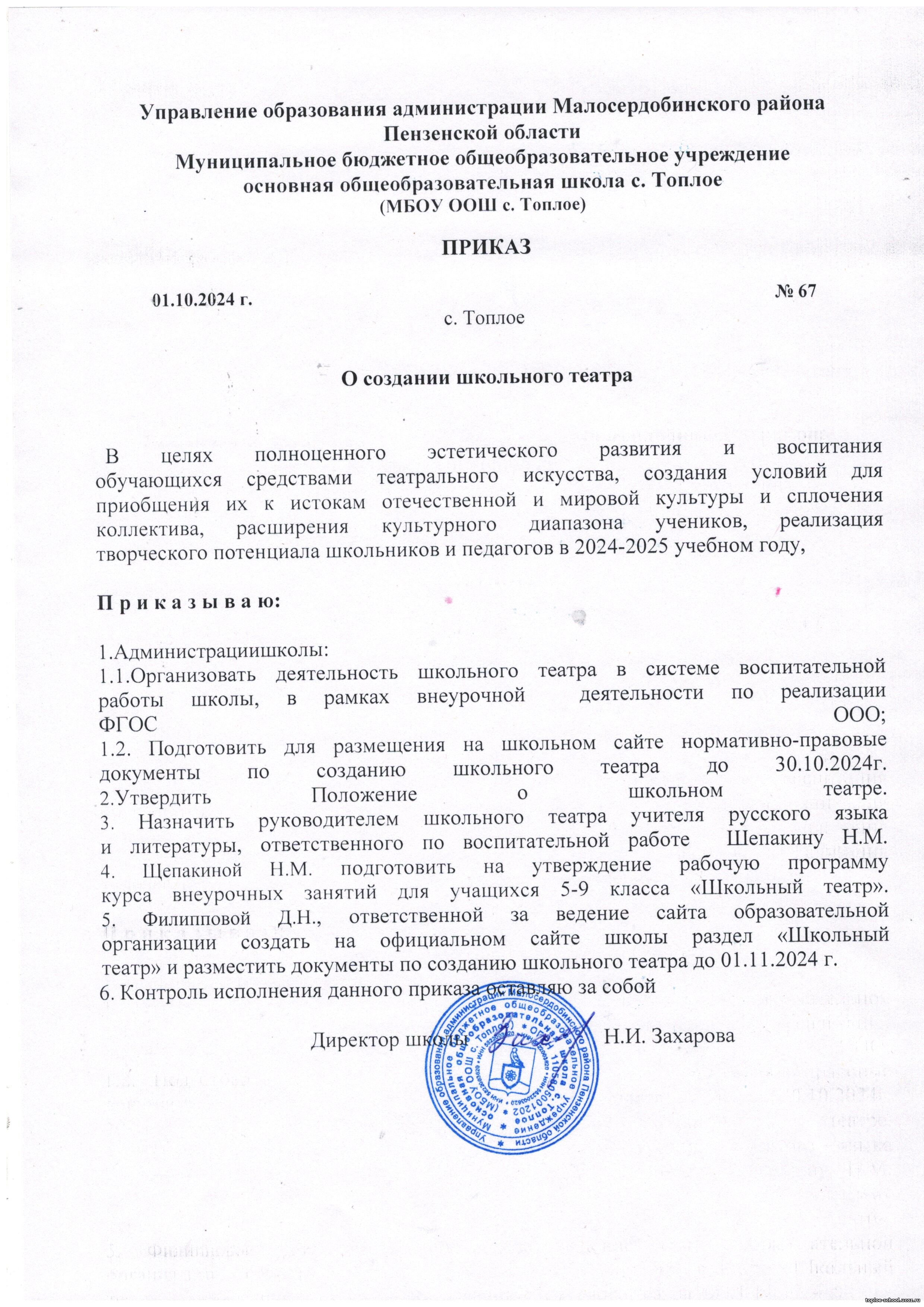 Приказ от 01.10.2024 г. №67 "О создании школьного театра"